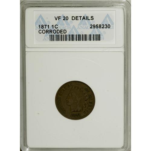 <B>1871 1C --Corroded--ANACS. VF20 Details.</B></I> NGC Census: (19/278). PCGS Population (1/241). Mintage: 3,929,500. Numismedia Wsl. Price: $225. (#2100)<BR><BR><b>Shipping:</b> Coins & Currency (<a target="_blank" href="http://www.heritageauctions.com/common/shipping.php">view shipping information</a>)
