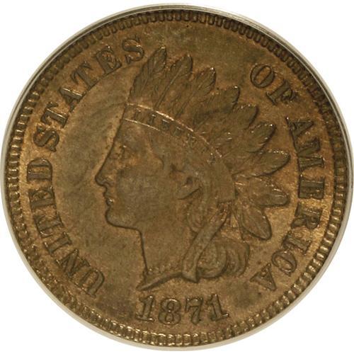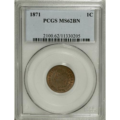 <B>1871 1C MS62 Brown PCGS.</B></I> PCGS Population (12/60). NGC Census: (33/109). Mintage: 3,929,500. Numismedia Wsl. Price: $442. (#2100)<BR><BR><b>Shipping:</b> Coins & Currency (<a target="_blank" href="http://www.heritageauctions.com/common/shipping.php">view shipping information</a>)