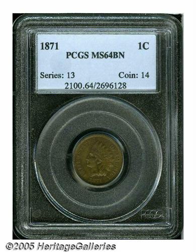 <B>1871<1C> MS64 Brown PCGS.</B></I> Sharply struck and near-pristine, with orange luster shining through the primarily tobacco-brown coloration, especially on the reverse. A single small contact mark, just beneath Liberty's chin, is the only evident surface flaw. Perhaps conservatively graded as a near-Gem. Population: 17 in 64 Brown, 4 finer with Brown color (3/05).
