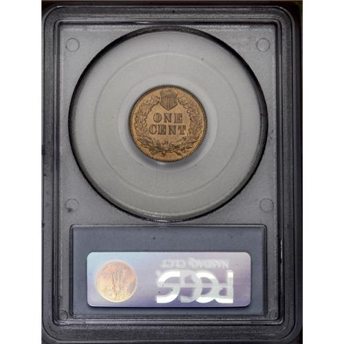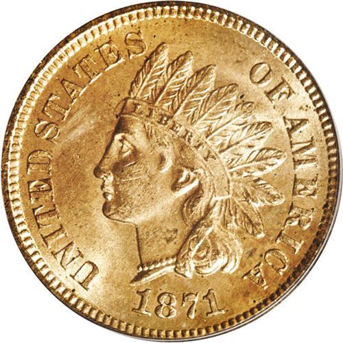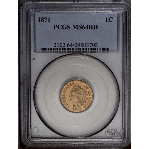 <B>1871<1C> MS64 Red PCGS.</B></I> This pinpoint-sharp Choice semi-key Indian cent features lovely brick-red color. Carbon is present but inconsequential. A few small blemishes on the cheek and chin decide the grade. Faint clash marks are noted near the forehead and on the C in CENT. The N in ONE is bold, the more common of two reverse hub styles in use between 1870 and 1873.