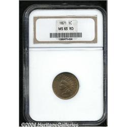 <B>1871<1C> MS65 Red NGC.</B></I> Razor sharp with satin-like fields and attractive amber-gold coloration evenly dispersed over the smooth surfaces. A couple of marks are visible on the principal obverse device. The 1871 is one of the most elusive Indian Cent issues in Red Uncirculated grades, of comparable rarity to dates such as the 1872 and 1877. Population: 4 in 65, none finer (4/04). <BR><BR><B>Important notice:</B> Heritage usually auctions material at the rate of 200-250 lots per hour. On some occasions eBay Live bid software or the Internet may not be able to keep up with the pace of the auction. We recommend placing a realistic absentee bid now as insurance to avoid disappointment. Occasionally the auctioneer may eliminate or reject an eBay Live bid, and the auctioneer may also reopen a lot after the close of the eBay live bidding (usually because we missed an audience bid), and may reject your bid even if it shows you as the winning bidder. By bidding via eBay Live, you agree that Heritage may award the lot to another bidder at its sole discretion under the circumstances described above or any other reasonable circumstances. Since eBay bids are not shown to us until we open the lot on the floor, we treat those bids just like floor bids. In most cases the floor responds before the eBay bid is presented to us, due to Internet lag time, so for consistency we have made it a policy that floor bids are always considered first over tie eBay live bids. Also please note that all Heritage lots purchased through eBay Live carry a 20% Buyer's Premium. Please make sure you read the Terms and Conditions before you bid.