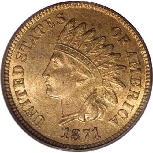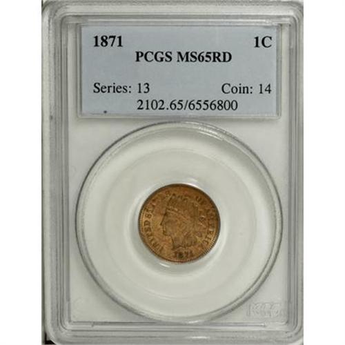 <B>1871 1C MS65 Red PCGS.</B></I> Bold N in ONE. This satiny yellow-orange Gem has an intricate strike and is nearly void of carbon. The abrasion-free surfaces exhibit a few faint clash marks, as made. One of the lowest mintage dates in the series. Population: 16 in 65 Red, 2 finer (7/07).<I><BR>From The Santa Fe Collection.</B></I><BR><BR><B>Coin Engraver:</B> James B. Longacre<BR><BR><b>Shipping:</b> Coins & Currency (<a target="_blank" href="http://www.heritageauctions.com/common/shipping.php">view shipping information</a>\)