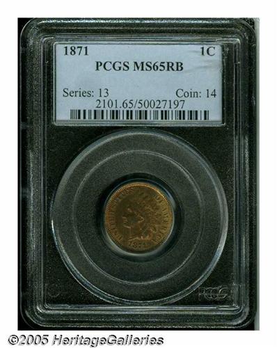 <B>1871<1C> MS65 Red and Brown PCGS.</B></I> Well struck with variegated purple-red, yellow-green, and orange toning, on both sides. This lovely Gem also boasts vibrant, sparkling luster, and shows no appreciable blemishes on either obverse or reverse. Population: 31 in 65 Red and Brown, 0 finer in Red and Brown (3/05).