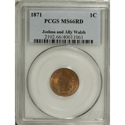 <B>1871 1C MS66 Red PCGS.</B></I> Ex: Joshua and Ally Walsh Collection. Beginning in 1857, the government started to redeem half cents and large cents and melt them for recoinage into Indian cents. According to Rick Snow (2006):<BR><BR> "The Mint Act of March 3, 1871, provided much-needed authorization for the Mint to redeem the nickel and bronze coinage that was clogging up commercial channels. Because these coins didn't have a bullion value close to their face value, and because their legal-tender status was limited, banks had had nowhere to go to turn in excess coinage. Now the Mint was given the legal authorization to do what it had been doing for the past few years anyway."<BR><BR> By 1871, the supply of such redeemed coins had dwindled so low that the Philadelphia Mint could produce only 3.9 million new cents. Most of these coins were placed directly into circulation, where they remained until well worn or lost. As a result, the 1871 is one of the premier condition rarities in the Indian cent series, with PCGS reporting just two coins at the MS66 Red level of preservation; NGC has not graded one finer than MS65. This attractive and important Gem is alive with red-orange and copper-golden luster that is free from toning. Both sides are also devoid of distracting handling marks, and the razor-sharp strike should not be overlooked. A more attractive example of this conditionally rare issue is difficult to imagine. Population: 2 in 66, 0 finer (3/07).<BR><BR><b>Shipping:</b> Coins & Currency (<a target="_blank" href="http://www.heritageauctions.com/common/shipping.php">view shipping information</a>)