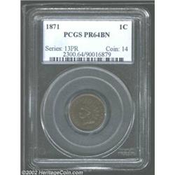 1871 1C PR64 Brown PCGS. Violet patina predominates, with a splash of aqua on the devices that is visible when the Cent is rotated under a light. Exquisitely preserved, and attractive despite the rich colors. Well struck aside from the base of the N in ONE, which is in lower relief. Important notice: We expect to be auctioning lots at the rate of 200-250 per hour. Sometimes eBay Premier live bid software cannot keep up with that pace, so we strongly recommend that you place a realistic proxy bid now as insurance to avoid disappointment. Also please note that all Heritage/CAA lots purchased through eBay Premier carry a 20% Buyer's Premium. Please make sure you read the Terms and Conditions.