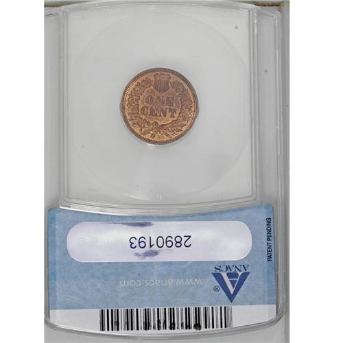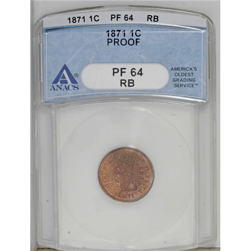 <B>1871<1C> PR64 Red and Brown ANACS.</B></I> Shallow N in ONE. This crisply struck near-Gem is more than 50% bright gold, although the upper obverse and central reverse have acquired olive and magenta shades. A low mintage date.