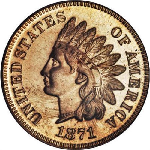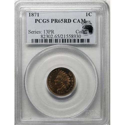 <B>1871 1C PR65 Red Cameo PCGS.</B></I> Shallow N in ONE. A meticulously struck Gem with radiant pumpkin-orange color and only a whisper of carbon across each side. Interesting lintmarks on NIT in UNITED will identify this piece in any future sales. One of the lowest-mintage business strikes in the series, and proofs are also very popular. Population: 2 in 65 Red Cameo, 1 finer (12/07). <BR><BR><b>Shipping:</b> Coins & Currency (<a target="_blank" href="http://www.heritageauctions.com/common/shipping.php">view shipping information</a>)