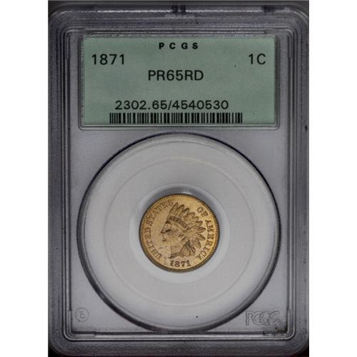 <B>1871<1C> PR65 Red PCGS.</B></I> A conditionally scarce survivor from an original proof delivery of at least 960 pieces, this coin is fully brought up over all elements of the design. Both sides are lustrous with dominant golden-orange hues that give way to delicate lilac tinting around the reverse periphery. A little bit of faint carbon is seen over the lower obverse, but the number and size of the flecks is not out of context with the PR65 grade level. Originally and carefully preserved. Population: 27 in 65, 2 finer (3/06). <BR><BR><B>Important notice:</B> Heritage usually auctions material at the rate of 200-250 lots per hour. On some occasions eBay Live bid software or the Internet may not be able to keep up with the pace of the auction. We recommend placing a realistic absentee bid now as insurance to avoid disappointment. Occasionally the auctioneer may eliminate or reject an eBay Live bid, and the auctioneer may also reopen a lot after the close of the eBay live bidding (usually because we missed an audience bid), and may reject your bid even if it shows you as the winning bidder. By bidding via eBay Live, you agree that Heritage may award the lot to another bidder at its sole discretion under the circumstances described above or any other reasonable circumstances. Since eBay bids are not shown to us until we open the lot on the floor, we treat those bids just like floor bids. In most cases the floor responds before the eBay bid is presented to us, due to Internet lag time, so for consistency we have made it a policy that floor bids are always considered first over tie eBay live bids. Also please note that all Heritage lots purchased through eBay Live carry a 20% Buyer's Premium. Please make sure you read the Terms and Conditions before you bid. This lot is being auctioned in conjunction with a live floor auction by Heritage Galleries & Auctioneers. All final auction and invoice information will be supplied by Heritage Galleries & Auctioneers, and all other information should be considered preliminary. Lot:440 <BR><BR><B>Winning Notification and Billing:</B> After the FINAL session in this auction is complete, Heritage will send e-mail and snail mail invoices. This process normally takes several days. All final auction and invoice information will be supplied by Heritage Galleries & Auctioneers, and all other information should be considered preliminary. <BR><BR>This auction will be conducted on a live auction floor and over the Internet through eBay Live. If you choose to place an absentee bid, please take a moment to <font color='#0000ff'><u><a href='http://pages.ebay.com/liveauctions/help/before/laabsentee.html'>learn how eBay Live absentee bidding works</a></u></font><font color='#000000'>