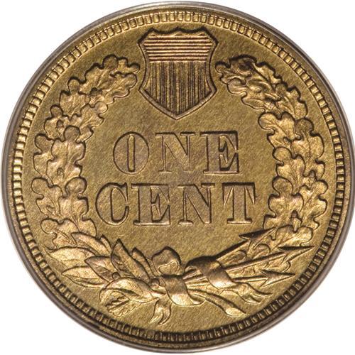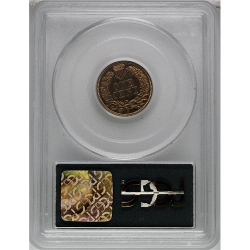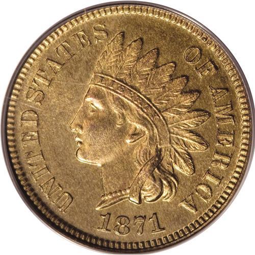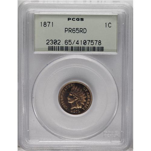 <B>1871 1C PR65 Red PCGS.</B></I> Shallow N in ONE. Light olive-gold color dominates both sides, while the reverse center has rich ruby-red hues. Meticulously struck and beautifully preserved. A short lintmark (as made) rests below IC in AMERICA. This low mintage cent is certified in an old green label holder. Population: 27 in 65 Red, 2 finer (2/07).<BR><BR><b>Shipping:</b> Coins & Currency (<a target="_blank" href="http://www.heritageauctions.com/common/shipping.php">view shipping information</a>)