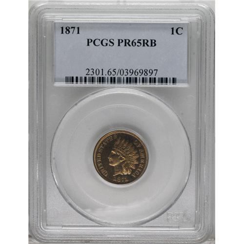 <B>1871 1C PR65 Red and Brown PCGS.</B></I> Shallow N in ONE. The obverse border is peach, as is the reverse center. Olive-gold dominates the obverse, and visits the reverse border. Close to full red, and carbon is minimal. A popular low mintage date.<BR><BR><b>Shipping:</b> Coins & Currency (<a target="_blank" href="http://www.heritageauctions.com/common/shipping.php">view shipping information</a>)