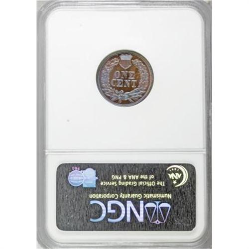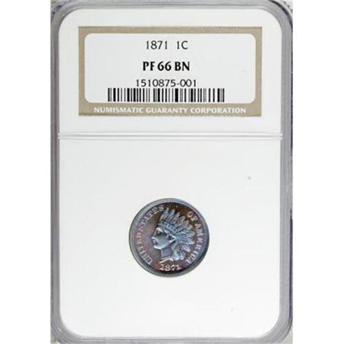 <B>1871 1C PR66 Brown NGC.</B></I> Shallow N in ONE. A remarkably preserved and originally toned example of this better date in the proof Indian cent series. The design elements reveal razor-sharp details throughout, including the feather tips of the headdress. Contact marks and hairlines are nonexistent. Census: 2 in 66 Brown, 0 finer (7/07). <BR><BR><B>Coin Engraver:</B> James B. Longacre<BR><BR><b>Shipping:</b> Coins & Currency (<a target="_blank" href="http://www.heritageauctions.com/common/shipping.php">view shipping information</a>)