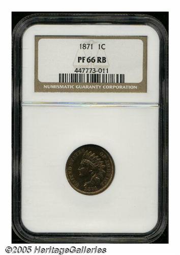 <B>1871<1C> PR66 Red and Brown NGC.</B></I> Fully struck with exquisitely preserved surfaces that seem pristine. Rich reddish-bronze toning blankets both sides. This is a scarcer proof issue made even more desirable by the lack of quality business strikes. Population: 9 in 66 Red and Brown, 0 finer in Red and Brown (6/05).