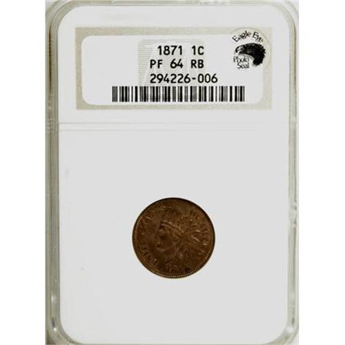<B>1871 1C PR64 Red and Brown NGC.</B></I> Eagle Eye Photo Seal. NGC Census: (51/53). PCGS Population (91/43). Mintage: 960. Numismedia Wsl. Price for NGC/PCGS coin in PR64: $525. (#2301)<BR><BR><B>Coin Engraver:</B> James B. Longacre<BR><BR><b>Shipping:</b> Coins & Currency (<a target="_blank" href="http://www.heritageauctions.com/common/shipping.php">view shipping information</a>)