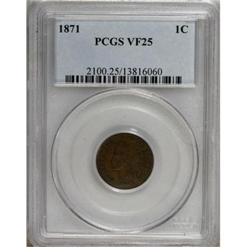 <B>1871 1C VF25 PCGS.</B></I> PCGS Population (13/246). NGC Census: (3/255). Mintage: 3,929,500. Numismedia Wsl. Price for NGC/PCGS coin in VF25: $234. (#2100)<BR><BR><B>Coin Engraver:</B> James B. Longacre<BR><BR><b>Shipping:</b> Coins & Currency (<a target="_blank" href="http://www.heritageauctions.com/common/shipping.php">view shipping information</a>)
