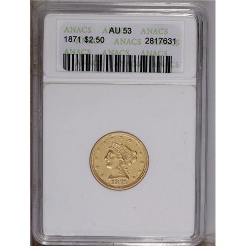 <B>1871 $2 1/2 AU53 ANACS.</B></I> A scarce issue with an impressively low mintage of only 5,350 pieces. This is a well struck coin with muted luster, even light coloration, and a relatively small quantity of trivial contact marks, for an AU example.