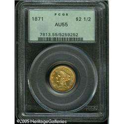 <B>1871 $2 1/2 AU55 PCGS.</B></I> Well struck and seemingly free of wear, with numerous hairlines and milky bluish-green color evident on obverse and reverse. A scarce, low mintage date with only 5,350 business strikes produced. Population: 12 in 55, 27 finer (1/05). Lot:7612