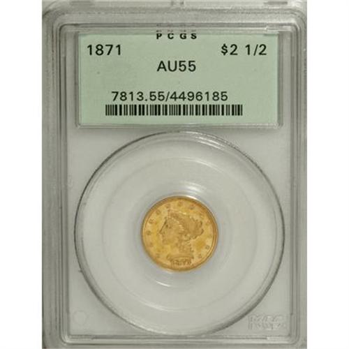 <B>1871 $2 1/2 AU55 PCGS.</B></I> PCGS Population (13/30). NGC Census: (18/58). Mintage: 5,350. Numismedia Wsl. Price for NGC/PCGS coin in AU55: $700. (#7813)<BR><BR><B>Coin Engraver:</B> Christian Gobrecht<BR><BR><b>Shipping:</b> Coins & Currency (<a target="_blank" href="http://www.heritageauctions.com/common/shipping.php">view shipping information</a>\)