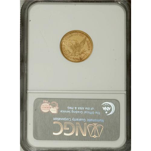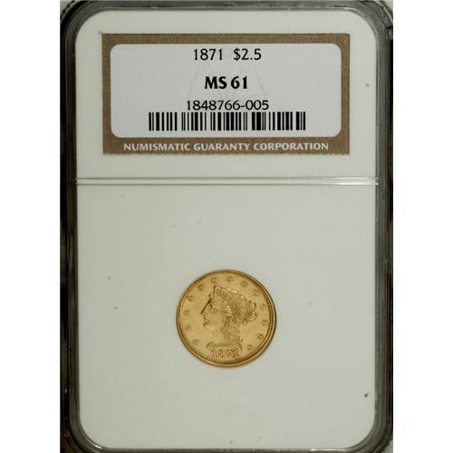 <B>1871 $2 1/2 MS61 NGC.</B></I> Each side has pleasing luster, though that of the reverse is stronger. This well struck piece's lightly abraded yellow-gold fields have a trace of emerald. Census: 13 in 61, 11 finer (1/07).<BR><BR><b>Shipping:</b> Coins & Currency (<a target="_blank" href="http://www.heritageauctions.com/common/shipping.php">view shipping information</a>)