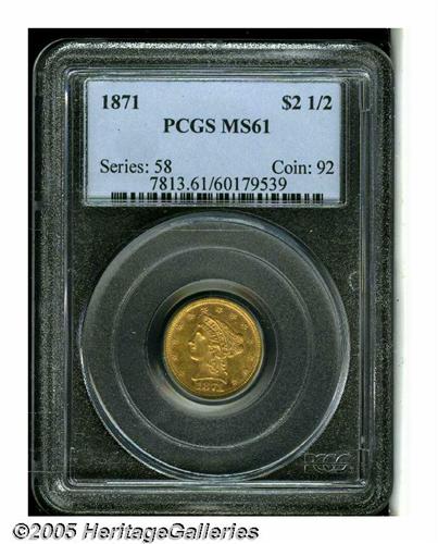 <B>1871<$2 1/2> MS61 PCGS.</B></I> Sharply struck and highly lustrous with exquisite orange-gold color. The fields are slightly reflective, imparting a delightful cameo appearance. Population: 3 in 61, 20 finer (5/05).
