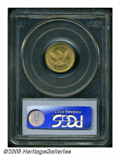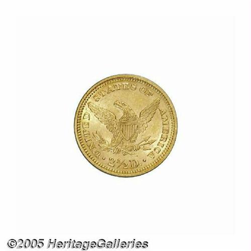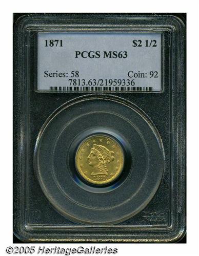 <B>1871<$2 1/2> MS63 PCGS.</B></I> A very scarce coin as only 5,350 pieces were struck with only a couple of dozen possibly extant today in mint condition. The current coin is sharply struck on the motifs, and displays pleasing peach-gold patina over lustrous surfaces. A few minor handling marks in the fields limit the grade. Population: 8 in 63, 6 finer (6/05).