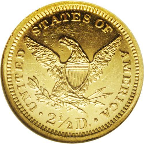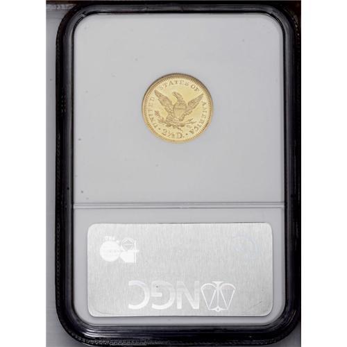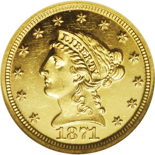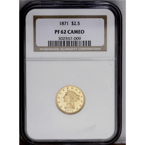 <B>1871 $2 1/2 PR62 Cameo NGC.</B></I> An extremely rare coin in any grade with perhaps a dozen to twenty survivors in all grades. The present coin retains most of the eye appeal and even has the added bonus of attractive mint frost on the devices, offsetting the mirrored fields. Examination with a loupe will discover a few trivial handling nicks in the reverse fields, and minor hairlines which account for the modest grade. A great coin for the collector who appreciates the regal nature of proof gold coinage, and the rarity as well.