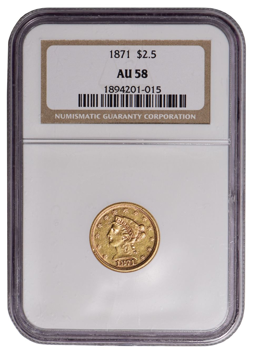 One 1871 $2.5 Liberty Quarter Eagle Gold Coin NGC AU58.