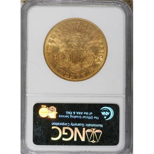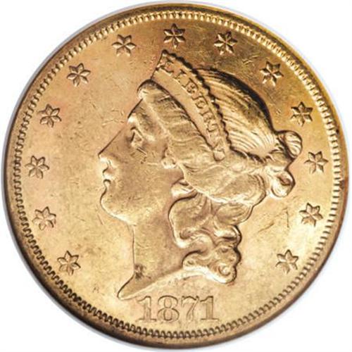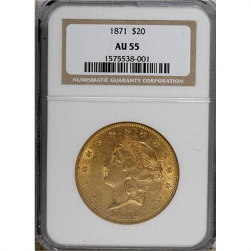 <B>1871 $20 AU55 NGC.</B></I> The 1871 is one of the scarcer Type Two twenties with a correspondingly low mintage of only 80,150 pieces. This bright orange-gold example shows glittering bits of luster around the obverse devices and significant luster over the reverse. Well struck for the type, there are numerous small abrasions scattered over each side.<BR><BR><B>Coin Engraver:</B> James B. Longacre<BR><BR><b>Shipping:</b> Coins & Currency (<a target="_blank" href="http://www.heritageauctions.com/common/shipping.php">view shipping information</a>\)