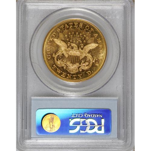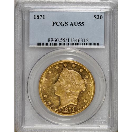 <B>1871 $20 AU55 PCGS.</B></I> A prooflike representative of this low mintage Philadelphia issue. This sharply struck piece has an unblemished reverse and only moderate obverse field marks and hairlines from brief circulation. Population: 24 in 55, 15 finer (2/07).<BR><BR><b>Shipping:</b> Coins & Currency (<a target="_blank" href="http://www.heritageauctions.com/common/shipping.php">view shipping information</a>)