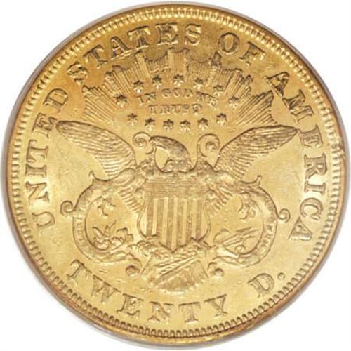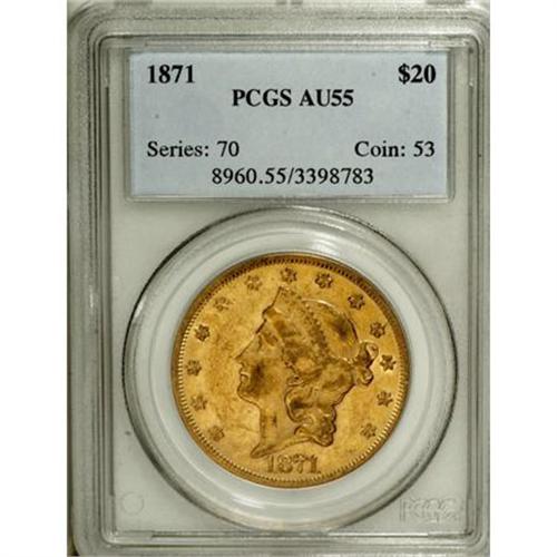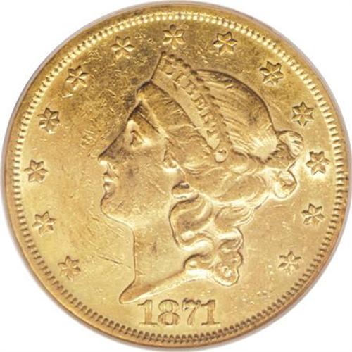 <B>1871 $20 AU55 PCGS.</B></I> The 1871 double eagle is clearly an underrated coin. Out of a relatively small mintage of 80,120 coins, the lowest of all Type Two Philadelphia issues, few coins survive in AU condition or better. Those examples that are extant are often found with abraded surfaces or other impairments. The numbers attest to this fact: As of (6/07), PCGS has certified 24 pieces in AU55, with only 15 finer. However, one must assume that the population figures are artificially high due to resubmissions. The current example is only slightly abraded and displays honey-gold color over lustrous surfaces. A small mint-made rim defect at 3 o'clock on the reverse is noted.<BR><BR><b>Shipping:</b> Coins & Currency (<a target="_blank" href="http://www.heritageauctions.com/common/shipping.php">view shipping information</a>)