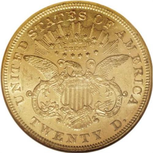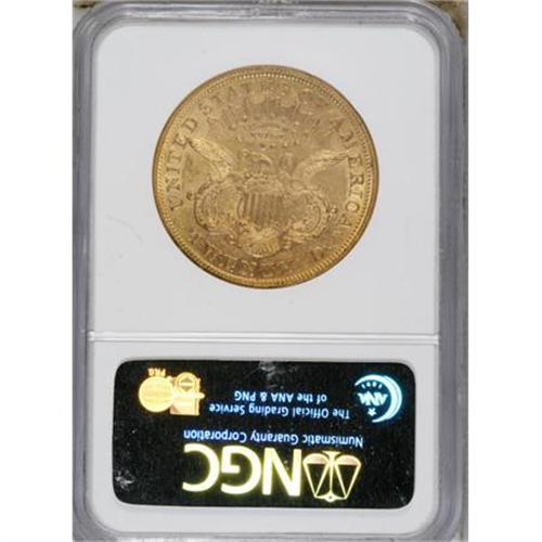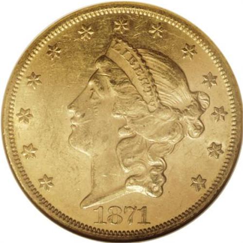 <B>1871 $20 MS60 NGC.</B></I> The 1871 is rare in Mint State for several reasons. It has a mintage of only 80,120 pieces. It was struck after the famous 1857 to 1865 gold-laden shipwrecks. It was struck prior to the large-scale export of U.S. gold to foreign bank holdings. Few collectors could afford to set aside twenty dollar pieces in 1871, and those who had the ability to do so selected proofs instead of business strikes. This sun-gold example is typically abraded on the left obverse, and displays light hairlines on the reverse field. Census: 2 in 60, 9 finer (5/07).<BR><BR><b>Shipping:</b> Coins & Currency (<a target="_blank" href="http://www.heritageauctions.com/common/shipping.php">view shipping information</a>)