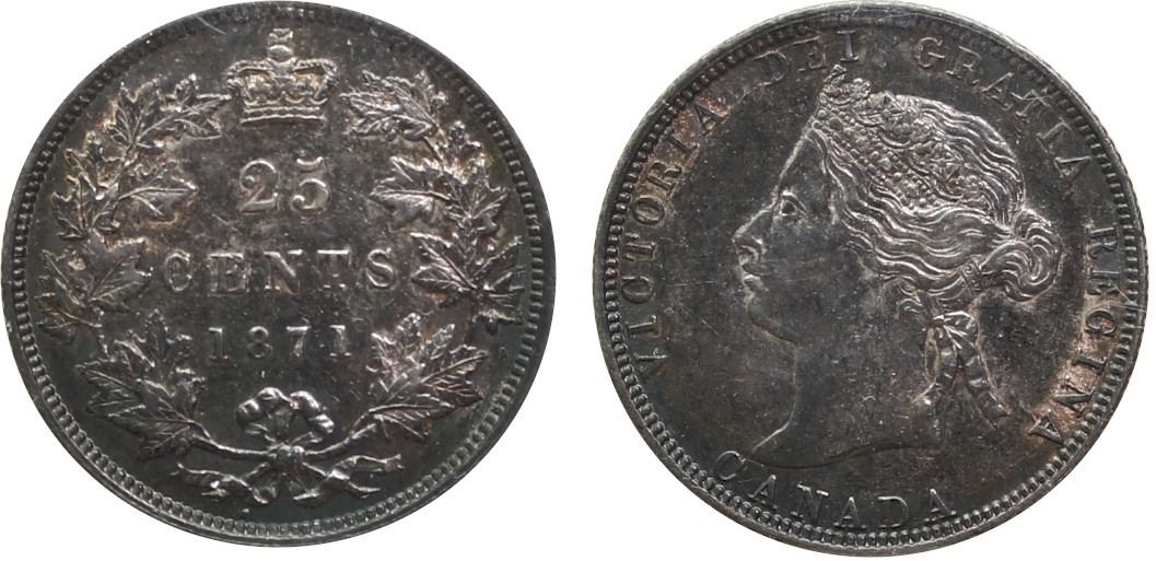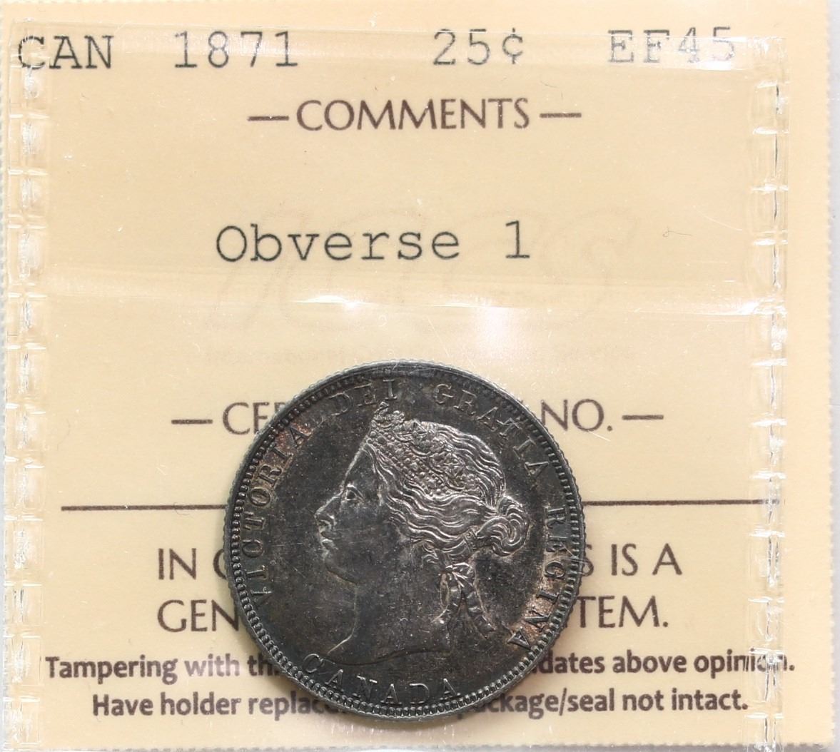 1871 25¢ "Obv.1" ICCS Choice Extra Fine-45, Lightly toned. Scarce obverse type.