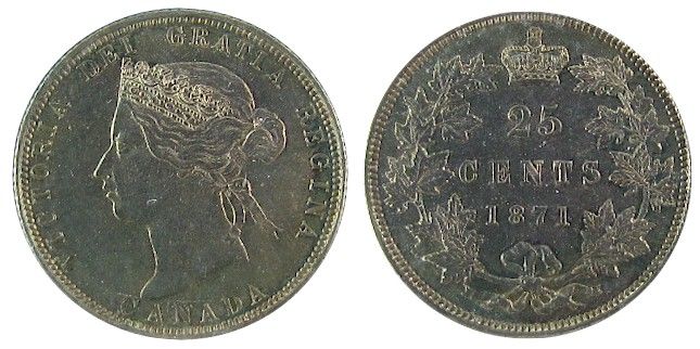 1871 25¢ Obv 2 ICCS MS64. Intense shades of blue and green with strong underlying lustre.