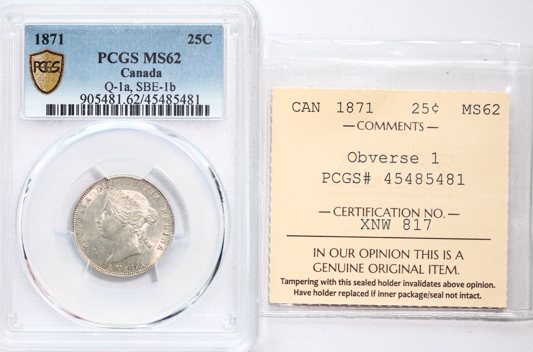This is an Internet, Live Internet, email, phone and mail auction sale conducted. Information provided by The Canadian Numismatic Company on our web site and in this catalog is strictly AS IS and/or strictly an opinion. No warranty given. Bids are per lot. No lots will be broken. Auction sales are not approval sales. All lots shall be sold to the highest bidder as determined by the auctioneer. If any dispute arises during the sale, the auctioneer has the right to reopen the lot and put it up for sale again. The auctioneer’s decision will be final. In the case of identical (tied) bids during our Live Auctions, the earliest received bid shall take priority. In the case of a tie bid during our Sales, between a mail/fax bid and an Internet bid, the Internet bid will take precedence and obtain the lot. PLEASE CONTACT US IF YOU REQUIRE FURTHER EXPLANATION.