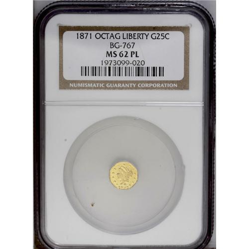 1871 25C BG-767 MS62 NGC. This example is struck from 1871[25C] Liberty Octagonal 25 Cents, BG-767,