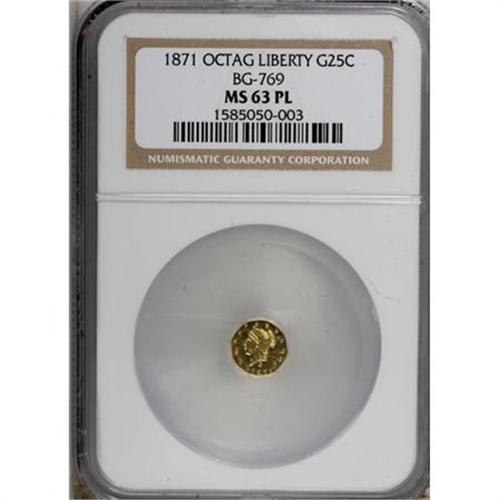 <B>1871 25C BG-769 Prooflike MS63 NGC.</B></I> NGC Census: (0/0). PCGS Population (0/0). (#710596)<BR><BR><b>Shipping:</b> Coins & Currency (<a target="_blank" href="http://www.heritageauctions.com/common/shipping.php">view shipping information</a>)