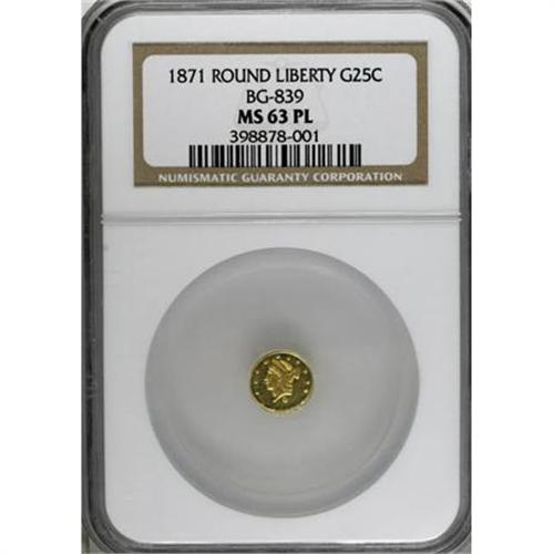 <B>1871 25C Liberty Round 25 Cents, BG-839, Low R.4, MS63 Prooflike NGC.</B></I> A gleaming sun-gold example that offers pleasing detail and modestly abraded surfaces. An interesting representative of this scarce issue, one that shows a single slender die crack from the right branch of the wreath. Census: 5 in 63 Prooflike, 1 finer (8/07).<BR><BR><b>Shipping:</b> Coins & Currency (<a target="_blank" href="http://www.heritageauctions.com/common/shipping.php">view shipping information</a>)