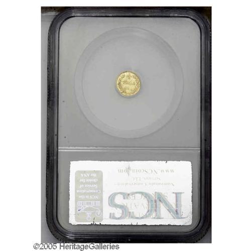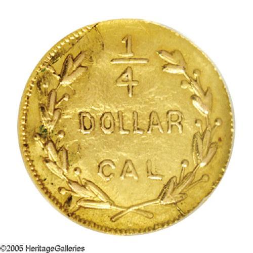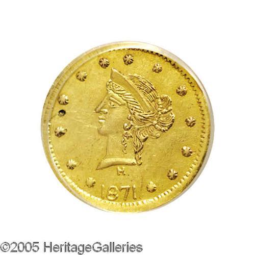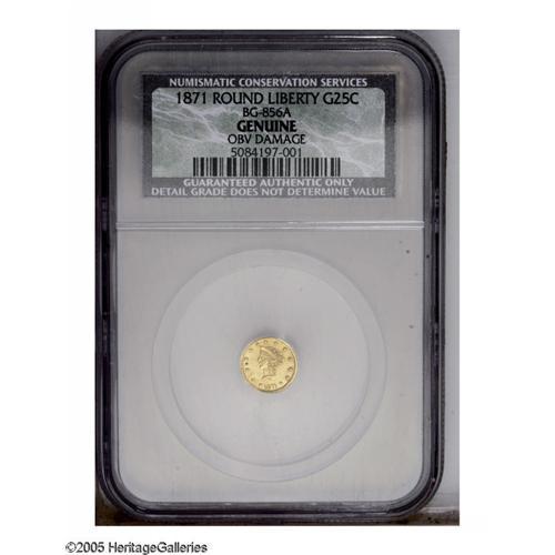 <B>1871<25C> Liberty Round 25 Cents, BG-856A, R.8--Obverse Damage--NCS.</B></I> This piece has Mint State sharpness, but a small hole is noted near 3 o'clock on the obverse. Nonetheless, very desirable due to the rarity of the variety. The Second Edition of Breen-Gillio states that only one survivor, the Jay Roe specimen, is known. The present piece is not the same coin.