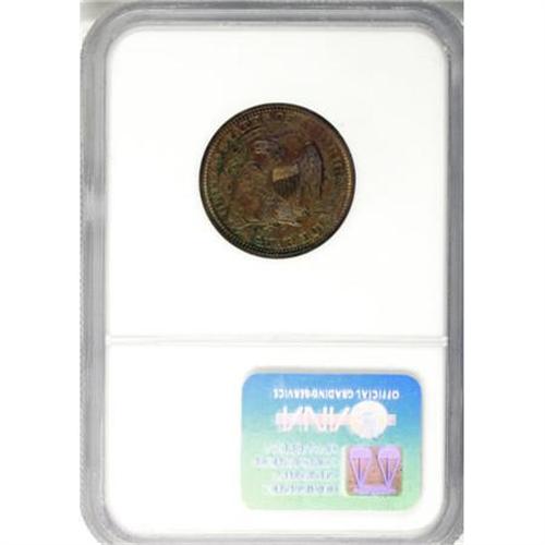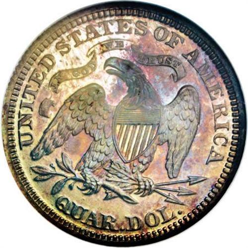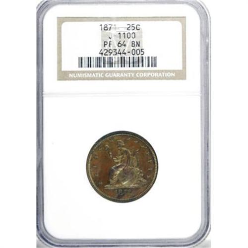 <B>1871 25C Quarter Dollar, Judd-1100, Pollock-1236, Low R.7, PR64 Brown NGC.</B></I> Longacre's Indian Princess obverse, paired with the regular dies reverse of 1870. This design was apparently implemented by William Barber, as Longacre died suddenly on New Year's Day of 1869. Struck in copper with a reeded edge. A lovely near-Gem, the present offering is moderately reflective in the fields, and the surfaces display a pleasing caramel-brown color, with much underlying rose and violet patina. A lintmark (as struck) on the reverse near IN identifies this example. A solitary hair-thin mark near the beak is all that denies a finer grade.<BR><BR><b>Shipping:</b> Coins & Currency (<a target="_blank" href="http://www.heritageauctions.com/common/shipping.php">view shipping information</a>)