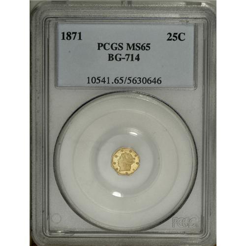 <B>1871 25C Liberty Octagonal 25 Cents, BG-714, R.3, MS65 PCGS.</B></I> A softly lustrous and frosted Gem. The greenish-gold centers are framed by vivid yellow-gold at the periphery. Population: 39 in 65, 23 finer (10/06).<BR><BR><b>Shipping:</b> Coin/Currency (<a target="_blank" href="http://www.heritageauctions.com/common/shipping.php">view shipping information</a>)