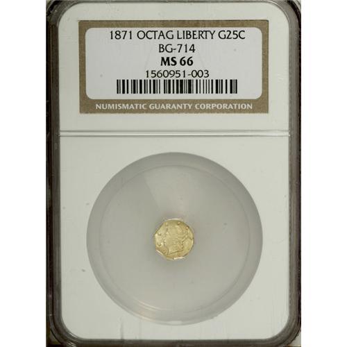 <B>1871 25C Liberty Octagonal 25 Cents, BG-714, R.3, MS66 NGC.</B></I> A highly lustrous and exquisitely preserved canary-gold example of this scarce variety. Minimally marked with pleasing detail. Census: 1 in 66, 0 finer (4/07).<BR><BR><b>Shipping:</b> Coins & Currency (<a target="_blank" href="http://www.heritageauctions.com/common/shipping.php">view shipping information</a>)