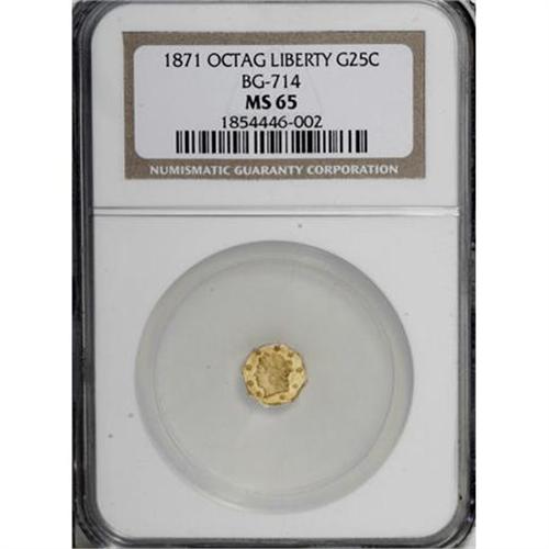 <B>1871 25C Liberty Octagonal 25 Cents, BG-714, R.3, MS65 NGC.</B></I> Large Liberty head with 9 stars, an undersized 4 in the fraction, and the D in DOLLAR partly embedded in the wreath. A pair of die cracks (as struck) connect the LL in DOLLAR with the 1s in the date. The orange peripheries surround prooflike, mint-green fields. The surfaces are free of distracting marks. <BR><BR><b>Shipping:</b> Coins & Currency (<a target="_blank" href="http://www.heritageauctions.com/common/shipping.php">view shipping information</a>)