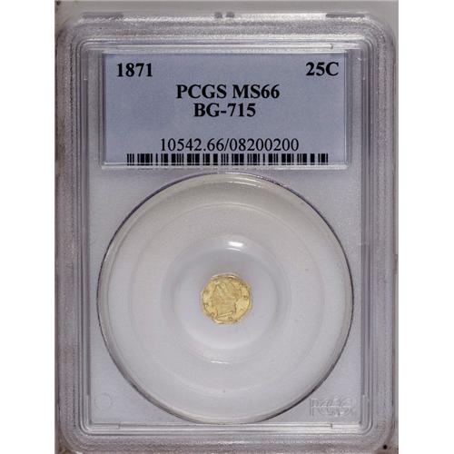 <B>1871<25C> Liberty Octagonal 25 Cents, BG-715, Low R.6, MS66 PCGS.</B></I> This splendidly preserved Premium Gem is light yellow-gold save for an orange blush on the left side of the wreath. Only slight incompleteness of strike in the centers denies apparent perfection. Population: 3 in 66, 0 finer (1/06).