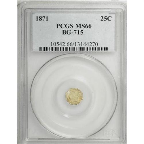 <B>1871 25C Liberty Octagonal 25 Cents, BG-715, Low R.6, MS66 PCGS.</B></I> Rich honey toning endows this well struck and undisturbed Premium Gem. The reverse legends display a network of fine die cracks. The wreath was entered at an angle, as was the date and denomination. Much scarcer than BG-714, which shares the same obverse die. Population: 5 in 66, 0 finer (12/07).<BR><BR><b>Shipping:</b> Coins & Currency (<a target="_blank" href="http://www.heritageauctions.com/common/shipping.php">view shipping information</a>)