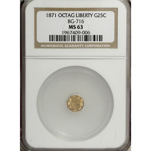 <B>1871 25C Liberty Octagonal 25 Cents, BG-717, R.3, MS63 NGC.</B></I> Evenly struck and flashy with generally smooth straw-gold surfaces. NGC has misattributed the piece as BG-716. Both varieties share the same obverse, but BG-716 has a close date.<BR><BR><b>Shipping:</b> Coins & Currency (<a target="_blank" href="http://www.heritageauctions.com/common/shipping.php">view shipping information</a>)