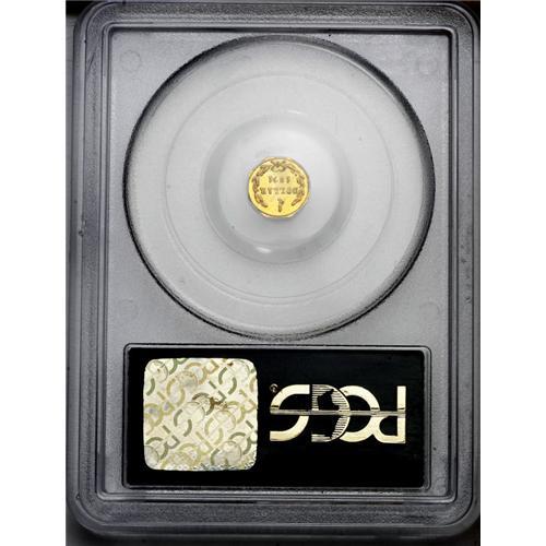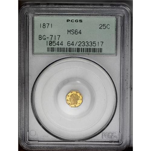 <B>1871<25C> Liberty Octagonal 25 Cents, BG-717, R.3, MS64 PCGS.</B></I> A flashy yellow-gold near-Gem with concentric lathe lines throughout the fields, as made. This crude variety has nine obverse stars and no fraction bar. In an old green label holder.