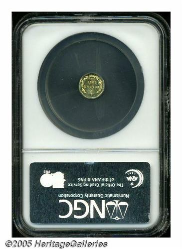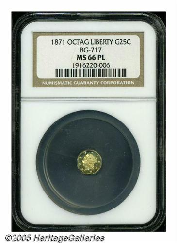 <B>1871<25C> Liberty Octagonal 25 Cents, BG-717, R.3, MS66 Prooflike NGC.</B></I> Prooflike fields, with frosted devices from a highly polished die. Attractive yellow-gold color, and sharply struck design elements. The surfaces are well preserved, and display no significant marks.