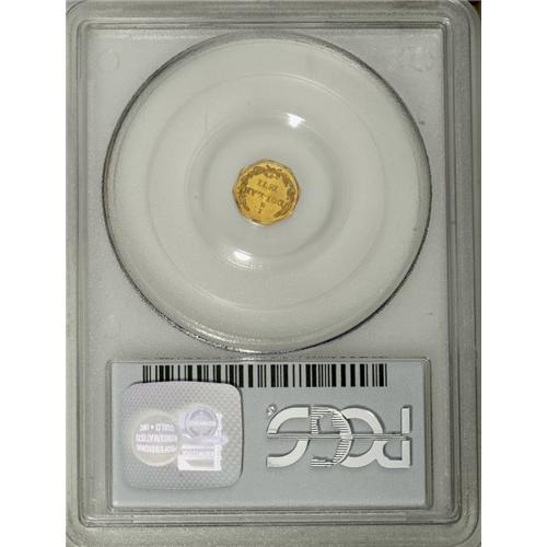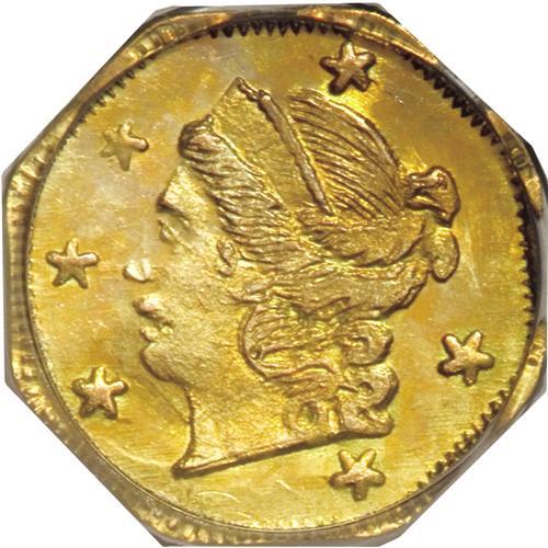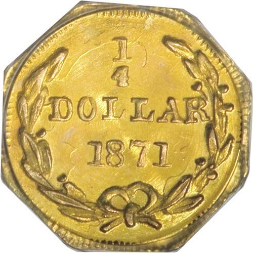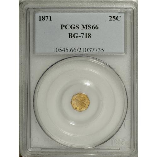 <B>1871 25C Liberty Octagonal 25 Cents, BG-718, R.7, MS66 PCGS.</B></I> Die clashing is seen on each side along with the drastically repolished surfaces which is responsible for much of the nose disappearing. An exceptional pumpkin-gold Premium Gem with flashy, unabraded fields. Population: 2 in 66, 0 finer (4/07).<BR><I>Ex: Robert A. Siegel (11/84), lot 464; The Thomas Young Collection of Cal Gold (Heritage, 2/02), lot 7197.</B></I><BR><BR><b>Shipping:</b> Coins & Currency (<a target="_blank" href="http://www.heritageauctions.com/common/shipping.php">view shipping information</a>)