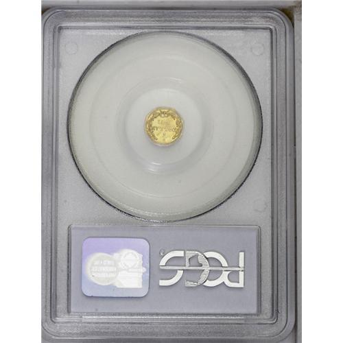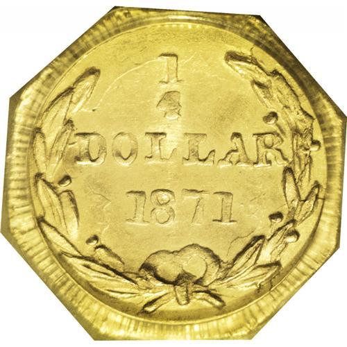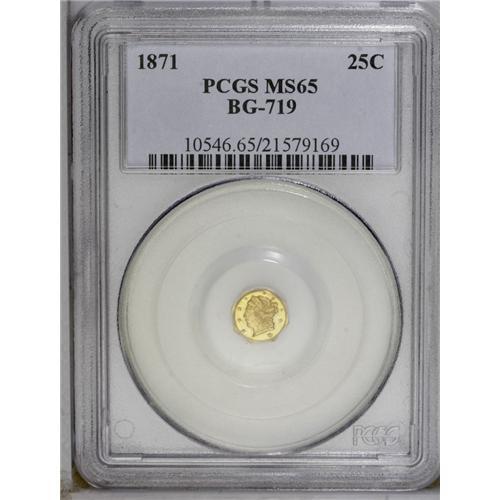 <B>1871<25C> Liberty Octagonal 25 Cents, BG-719, R.7, MS65 PCGS.</B></I> Die State II. <I>Probably the finest known.</B></I> An extremely rare die pairing which is seldom seen or offered. Frosty mint luster in the fields and generally attractive. The surfaces are clean, with no disturbances aside from minute hairlines. The present coin is a middle die state which is defined as having three minor die cracks on the reverse, all on the upper right from the rim to the wreath and clash marks in the center of the reverse. Examination will also confirm stress cracks on Liberty's neck, cheek and crown. In the terminal die state, this cracks to the wreath form a cud.<BR> There are perhaps six to 10 known of this issue. In the recent update of the Breen-Gillio <I>California Pioneer Fractional Gold</B></I> the authors enumerate nine examples, with possible duplication in that list. The present coin may have been a recently graded example, as no MS65 specimens are noted. No examples have been graded by NGC, and a mere six examples are listed in the PCGS <I>Population Report</B></I> with the present coin alone as the sole MS65, with none seen finer. For the specialist, the present coin would make a welcome addition to an advanced collection. <BR><BR><B>Important notice:</B> Heritage usually auctions material at the rate of 200-250 lots per hour. On some occasions eBay Live bid software or the Internet may not be able to keep up with the pace of the auction. We recommend placing a realistic absentee bid now as insurance to avoid disappointment. Occasionally the auctioneer may eliminate or reject an eBay Live bid, and the auctioneer may also reopen a lot after the close of the eBay live bidding (usually because we missed an audience bid), and may reject your bid even if it shows you as the winning bidder. By bidding via eBay Live, you agree that Heritage may award the lot to another bidder at its sole discretion under the circumstances described above or any other reasonable circumstances. Since eBay bids are not shown to us until we open the lot on the floor, we treat those bids just like floor bids. In most cases the floor responds before the eBay bid is presented to us, due to Internet lag time, so for consistency we have made it a policy that floor bids are always considered first over tie eBay live bids. Also please note that all Heritage lots purchased through eBay Live carry a 20% Buyer's Premium. Please make sure you read the Terms and Conditions before you bid. This lot is being auctioned in conjunction with a live floor auction by Heritage Galleries & Auctioneers. All final auction and invoice information will be supplied by Heritage Galleries & Auctioneers, and all other information should be considered preliminary. Lot:4787 <BR><BR><B>Winning Notification and Billing:</B> After the FINAL session in this auction is complete, Heritage will send e-mail and snail mail invoices. This process normally takes several days. All final auction and invoice information will be supplied by Heritage Galleries & Auctioneers, and all other information should be considered preliminary. <BR><BR>This auction will be conducted on a live auction floor and over the Internet through eBay Live. If you choose to place an absentee bid, please take a moment to <font color='#0000ff'><u><a href='http://pages.ebay.com/liveauctions/help/before/laabsentee.html'>learn how eBay Live absentee bidding works</a></u></font><font color='#000000'>