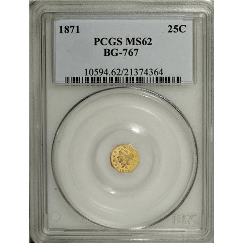 <B>1871 25C Liberty Octagonal 25 Cents, BG-765, R.3, MS62 PCGS,</B></I> a moderately mirrored and lightly abraded green-gold representative; and an <B>1871 Liberty Octagonal 25 Cents, BG-767, R.3, MS62 PCGS,</B></I> a sun-gold obverse with faint rose patina on the central reverse.<BR><BR><b>Shipping:</b> Coins & Currency (<a target="_blank" href="http://www.heritageauctions.com/common/shipping.php">view shipping information</a>)