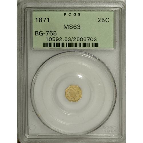 <B>1871 25C Liberty Octagonal 25 Cents, BG-765, R.3, MS63 PCGS.</B></I> The reflective fields are undisturbed, and the yellow-gold and apple-green patina further increases the eye appeal. Certified in a green label holder.<BR><BR><b>Shipping:</b> Coins & Currency (<a target="_blank" href="http://www.heritageauctions.com/common/shipping.php">view shipping information</a>)